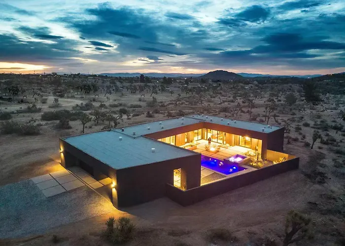 Located within 10 minutes' drive of Joshua Tree Retreat Center, the 2-bedroom Black C House Modern W Pool Spa Yucca Valley villa boasts a private pool with a hot tub.